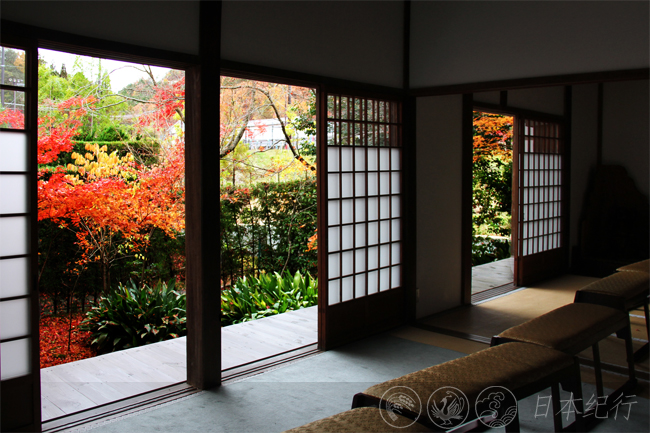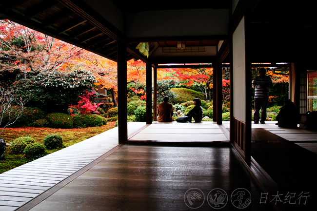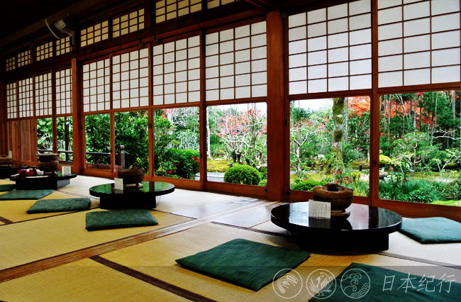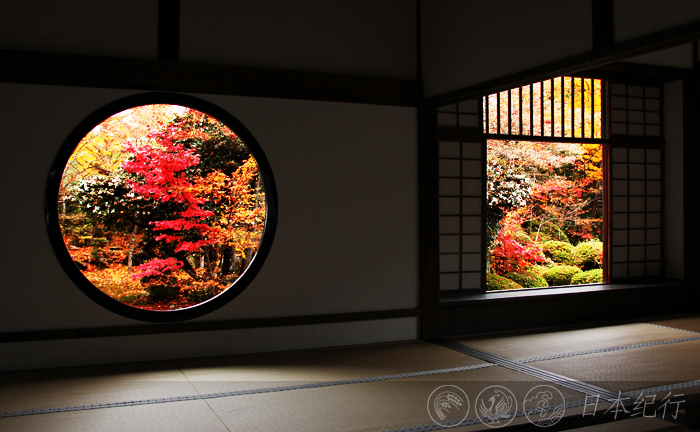 美好的事物总是让人不舍,我离开了毘沙门堂,走进幽静的曹洞宗禅院—鹰峰山宝树林源光庵。源光庵是个很特别的禅院,处处都张贴着意义深刻的警世名言。本堂里的圆窗和角窗更是给人印象深刻,许多人和我一样都是为了看一眼这两扇别具一格的窗子而特意赶来源光庵的。本堂左侧的圆窗代表禅、智慧和整个宇宙世界;右面的角窗代表人间世界的执迷不悟、逃脱不掉的生老病死和四苦八苦。窗外的景色四季变换,美不胜收。窗里窗外看世界,尽管是同样的景致角度不同感受却是不同。日本人以最简单的形态阐述了禅文化的博大精深,仿佛为到此一游的游客们免费上了一堂深奥的哲学课。