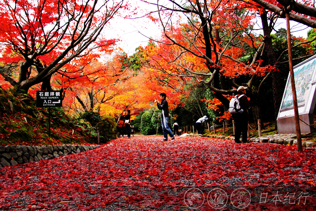 京都市右京区被登录世界文化遗产的龍安寺是此行的最后一站。在此之前因为参观了毘沙门堂和源光庵,所以以为在龍安寺不会再出现比前两处更让人感动的地方。可是当我走进龍安寺,看到红枫倒映的镜容池、代表日本禅家艺术的杰作仅由15块石头和白沙组成的“石庭”时,感到龍安寺里的一草一木都独具匠心。龍安寺建于15世纪末,原本是一所私人别墅,寺内方丈前的枯山水石庭最有名。石庭的东西长约25米,南北约10米,不借一草一木,简单素雅,与其它豪华的贵族庭院形成对比,成为日本文化的代表作之一。每年来龍安寺的游人很多,外国人也不在少数。大家坐在石庭前,有的人数着石头的数目,有的人静心凝视,对于石庭中15块石头的集合、离散、远近和起伏的理解与感悟任凭观者的思绪自然扩展。