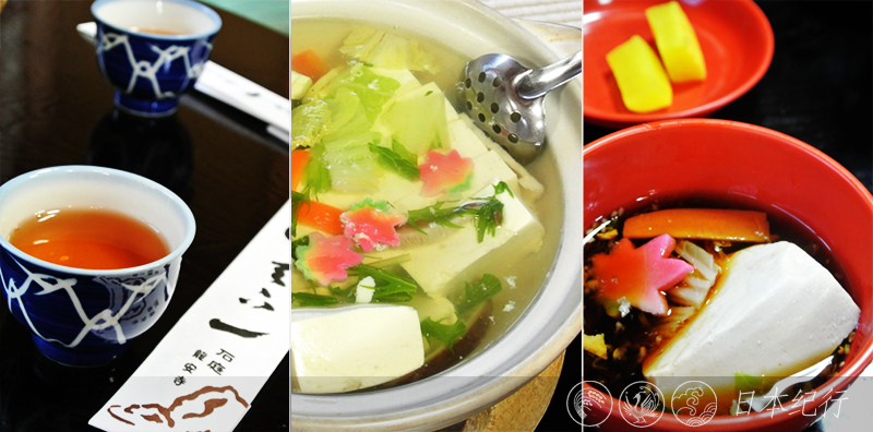 走出了石庭后,早已过了吃午饭的时间。汤豆腐是京都的代表料理,至从10年前品尝了一回后就再也没体味过。今天恰巧在龍安寺里有一家汤豆腐店,早就饥肠辘辘的我马上就决定走进代表京风的料理店。因为是下午3点,所以店里几乎不见其它客人,坐在榻榻米上围着热乎乎的豆腐锅,一边吃饭一边透过隔扇欣赏庭前的矮木和小桥流水,在恬淡安静的日本风情中结束这次京都枫叶之旅。