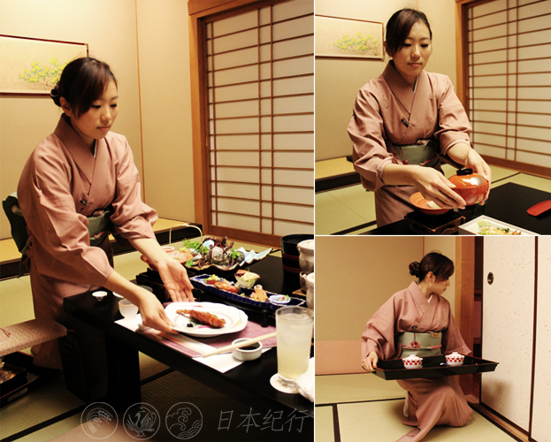 晚餐定在7点,在酒店四楼的日本料亭。鸟羽海滨温泉酒店很大,最多可容纳上千人。据说还有几处供几百人进餐的大宴会厅。每年年末,许多日本大型企业和各种团体组织都会选择在鸟羽海滨温泉酒店召开“忘年会”,整个酒店灯火通明,热闹非凡。来到四楼后,一名年轻的女服务员为我引路。她叫谷本幸惠,今年才21岁,是今晚专为我提供晚餐的服务员。谷本一身素雅的和服,头发利落地束在脑后,整个人看起来即干净又舒服。当我一落座,她便双膝跪在桌前,娴熟地报上菜名并介绍每道菜的特征及吃法。从谷本那里我了解到鸟羽海滨温泉酒店的宴席料理有好几十种,价格不同,想吃何种档次的料理在预定房间时由客人自己来决定。鸟羽海滨温泉酒店所在的鸟羽市自古就是海产富饶之地,想吃什么海鲜应有尽有。宴席中谷本又端上了几道菜,每次都是跪着进来,跪着出去,做法端庄有礼,细心周到。对于客人料理的味道自然重要,但让客人有宾至如归的感觉,才算得上是最高的服务。